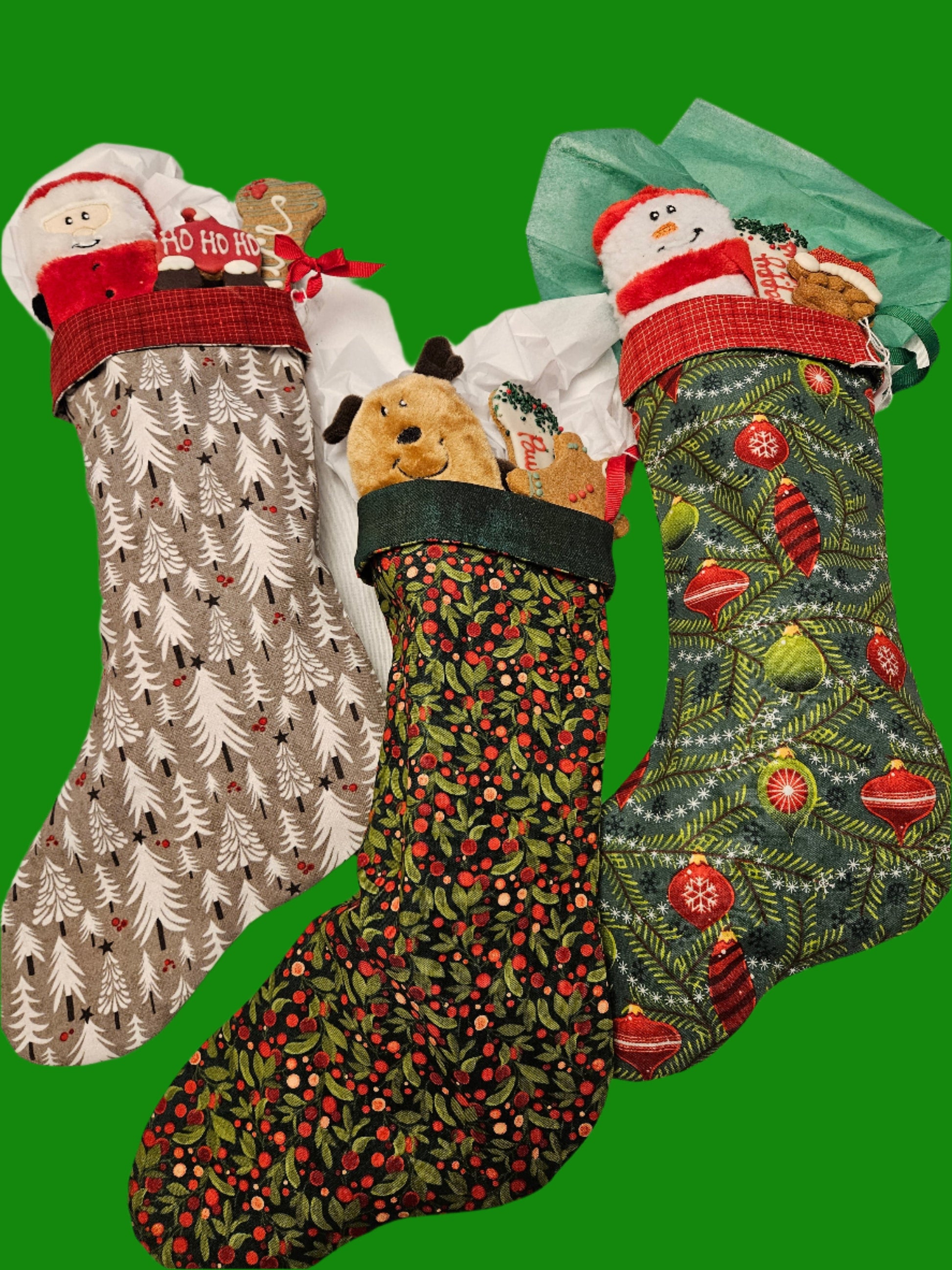 Small Stocking: This includes a sample of homemade treats and two delicious, human-grade holiday cookies. It's perfect for a bit of holiday surprise! Dimensions 9x6
